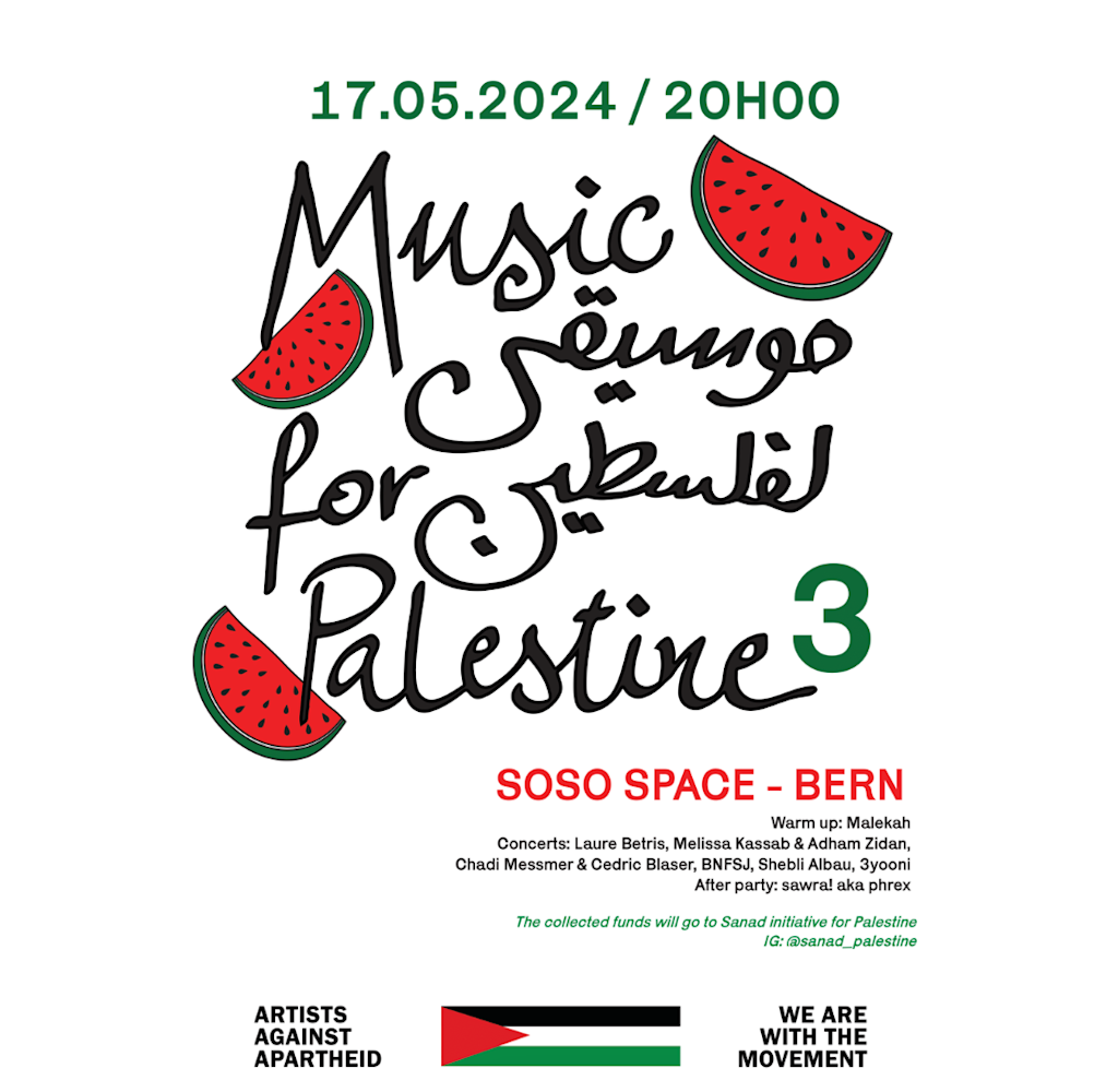 Music For Palestine 3 w. Laure Betris, Melissa Kassab, Adham Zidan, 3yooni, BNFSJ, Shebli Albau, Chadi Messmer, Cedric Blaser, sawra! aka Phrex & Maleikah